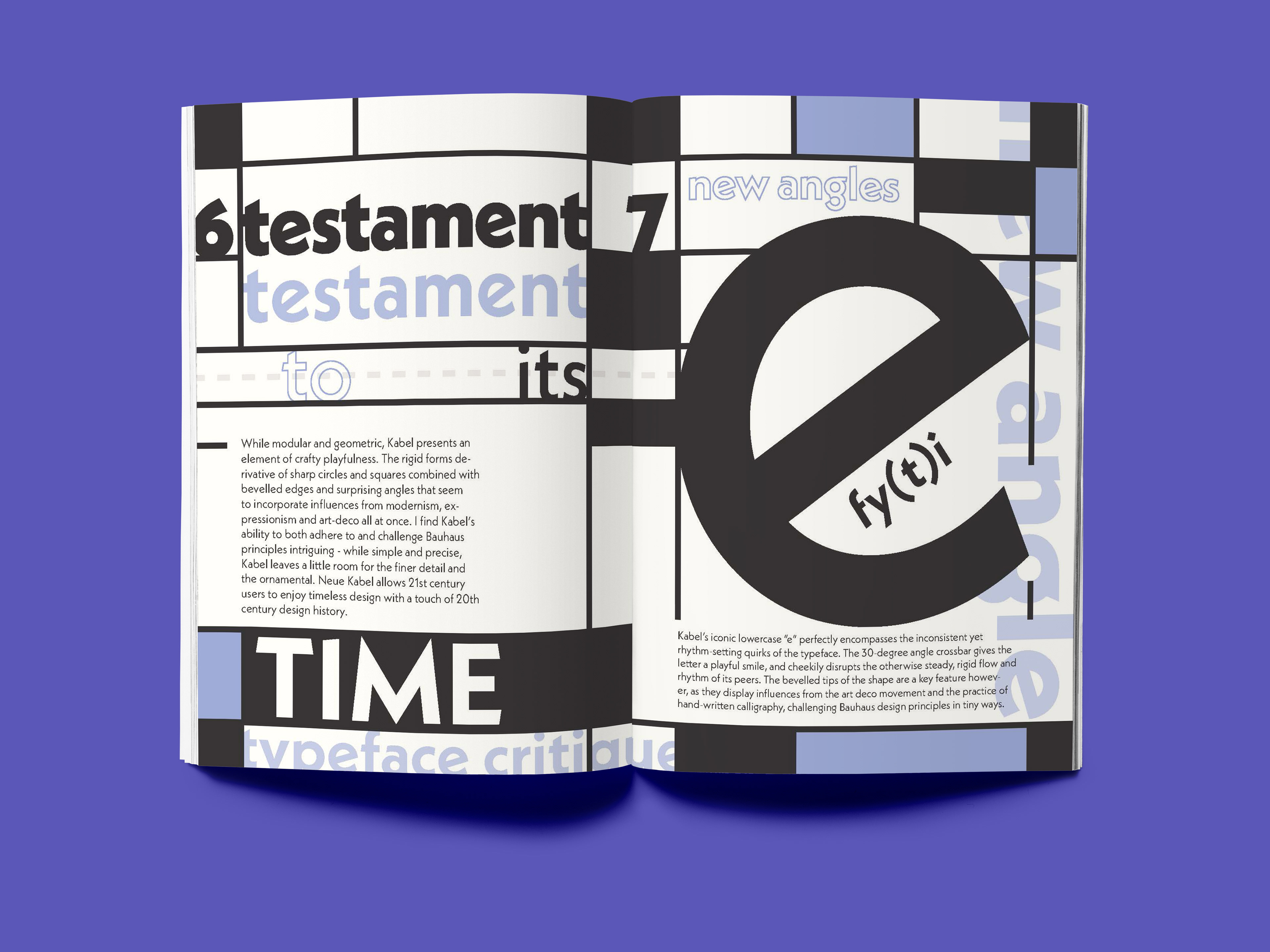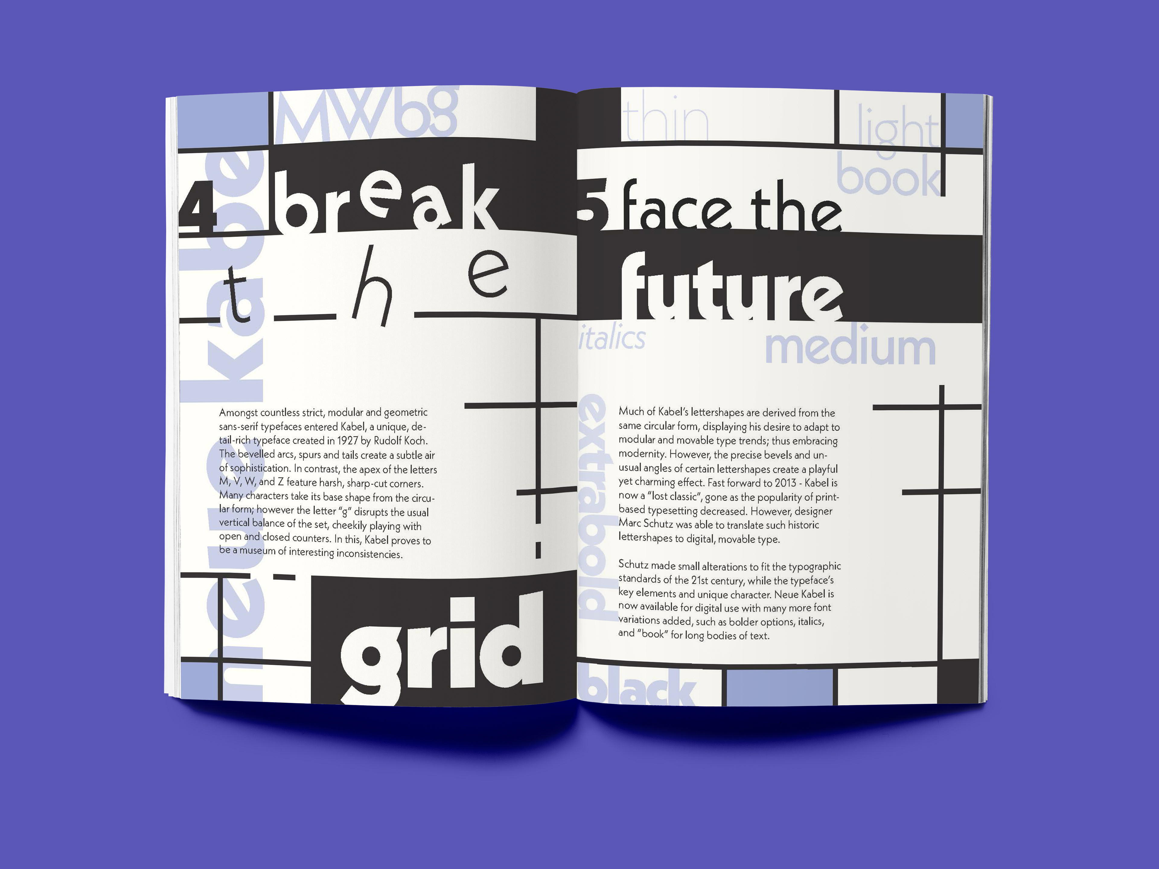 I critique the typeface’s integration of Bauhaus, Art Deco and calligraphic influences to showcase its unique, unconventional take on the modular, Modernist type trend that stormed the 1920s-30s design industry. By making and breaking the grid, I demonstrate how Kabel, too, breaks free of strict Bauhaus design standards at the time.